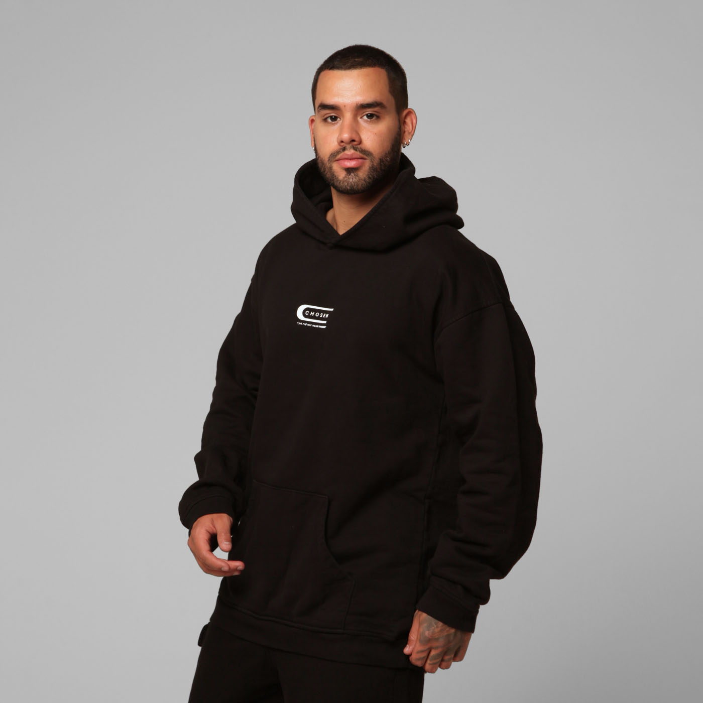 Made from 100% cotton heavyweight burda fabric (375 grams), featuring 2x2 ribbing on the cuffs and waistband. It has a front kangaroo pocket. It has a high-density print on the front. This product has a regular fit cut with a dropped shoulder.